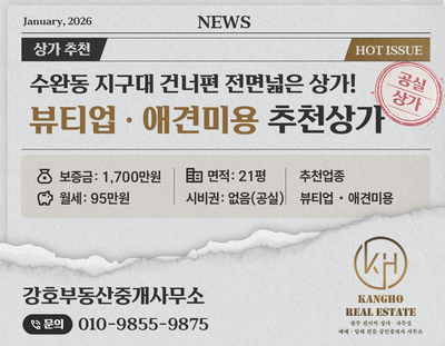 [추천업종:뷰티업]수완동 솟대 어린이 공원 건너편에 위치한 전면넓은 1층 공실상가!